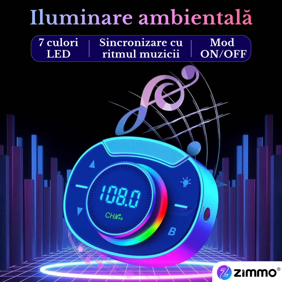 Conectarea este simplă: introduci modulatorul în priza de brichetă, alegi o frecvență radio liberă pe dispozitiv (ex: 87.5 MHz) și setezi aceeași frecvență pe radioul mașinii. Apoi, conectezi telefonul prin Bluetooth la „Zimmo® Modulator”.